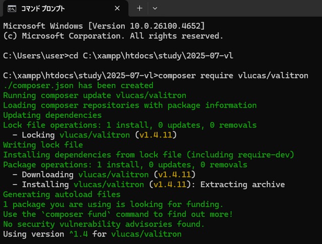 というわけで、さっそくvalitronをインストールしてみます。管理人のローカル・xampp環境でcomposerコマンドを使います。cd で作業ディレクトリを今回作ったディレクトリ(2025-07-vl)に移動し、composer require。