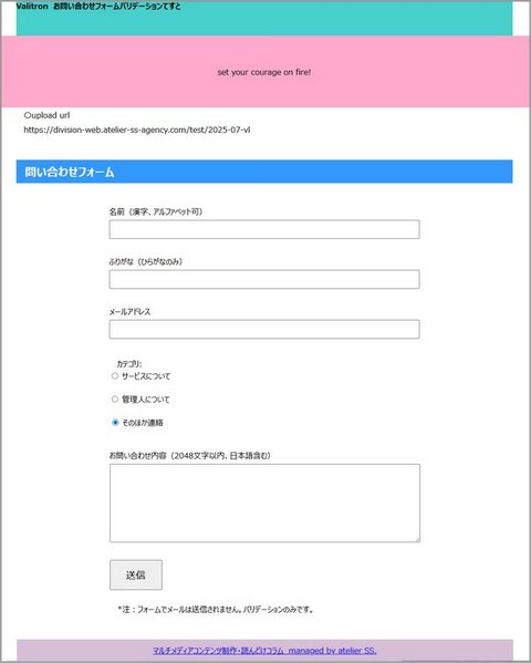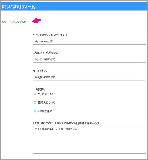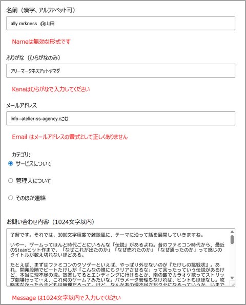 『記号が入っている無効な形式の名前』『ひらがな必須の項目にカタカナ』『正しくない形式のメールアドレス』『テキストエリアの文字数オーバー』も判定ok。