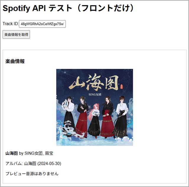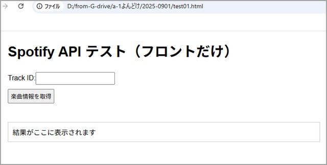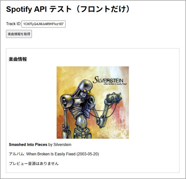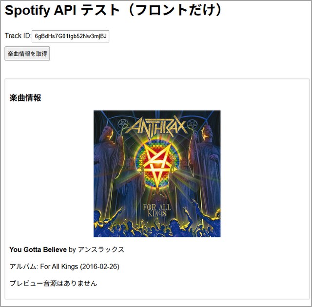 htmlとjavascriptで構築してみました。操作は、『spotifyのトラックidを入れてボタンを押すと、楽曲の情報が表示される』というもの。アクセストークン取得はなんか仕様上、直接GETメソッドで叩けないらしいので、method: POSTでheaderやbodyを設定して送信します。レスポンスの内容をinnerHTMLで要素にセットします。