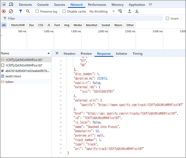 コンソールでレスポンス内容をチェックします。プレビュー用urlはnullでした。調査したところ曲の配信者が、そもそもプレビュー用urlを設定していないケースが多い模様です。データのほかの項目としては『popularity』とかも使えそうな気がします