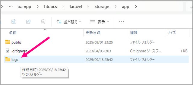 まず、仕様の『アップした画像のリストをデータベースではなく、任意の場所のtxtファイルに書き込んでいく』というやつです。mkdirコマンドを使って『logs』というディレクトリをstorage/app以下に作成。