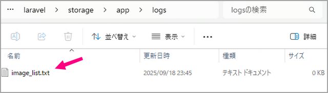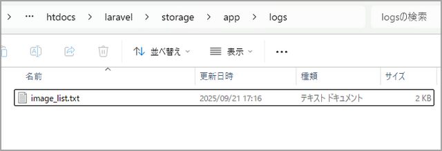 アップした画像のリストは『ルート/storage/app/logs』にテキストデータで。