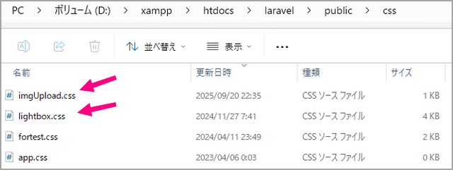 CSS・javascriptも準備します。アップロードページ用cssとlightbox用css。publicディレクトリに入っていて{{ asset('css/lightbox.css') }}のようにblade.phpから呼び出します。