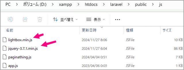 あとは、lightboxのjsと、jQueryのプラグインなんでjQueryも用意しますか。{{ asset('jjs/lightbox.min.js') }}のように呼び出します。