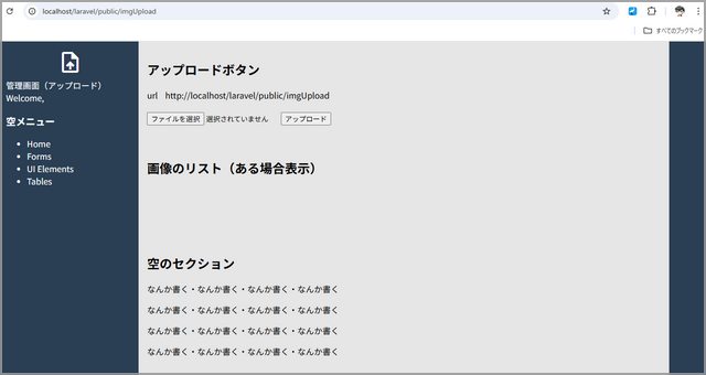 管理人xampp環境で設定されているhttp://localhost/laravel/public/imgUploadにアクセス。アップロード前はこんな感じでフォームだけ。